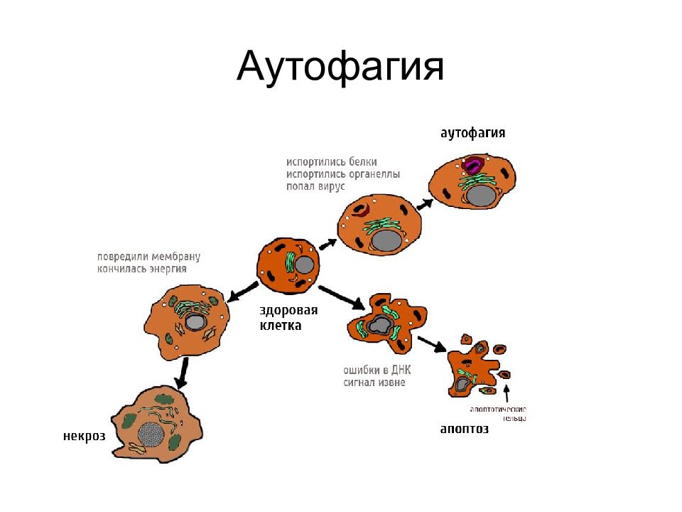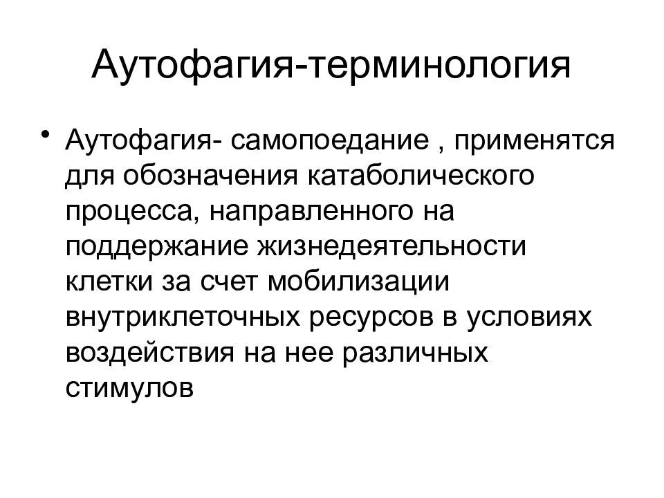 Аутофагия- самопоедание, применятся для обозначения катаболического процесса, направленного на поддержание жизнедеятельности клетки за счет мобилизации внутриклеточных ресурсов в условиях воздействия на нее различных стимулов