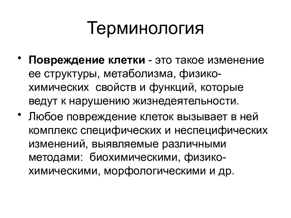 Повреждение клетки - это такое изменение ее структуры, метаболизма, физико-химических свойств и функций, которые ведут к нарушению жизнедеятельности. Любое повреждение клеток вызывает в ней комплекс специфических и неспецифических изменений, выявляемые различными методами : биохимическими, физико-химическими, морфологическими и др.