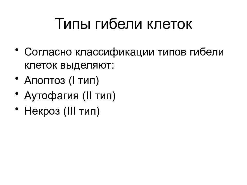 Согласно классификации типов гибели клеток выделяют : Апоптоз ( I тип) Аутофагия ( II тип) Некроз ( III тип)