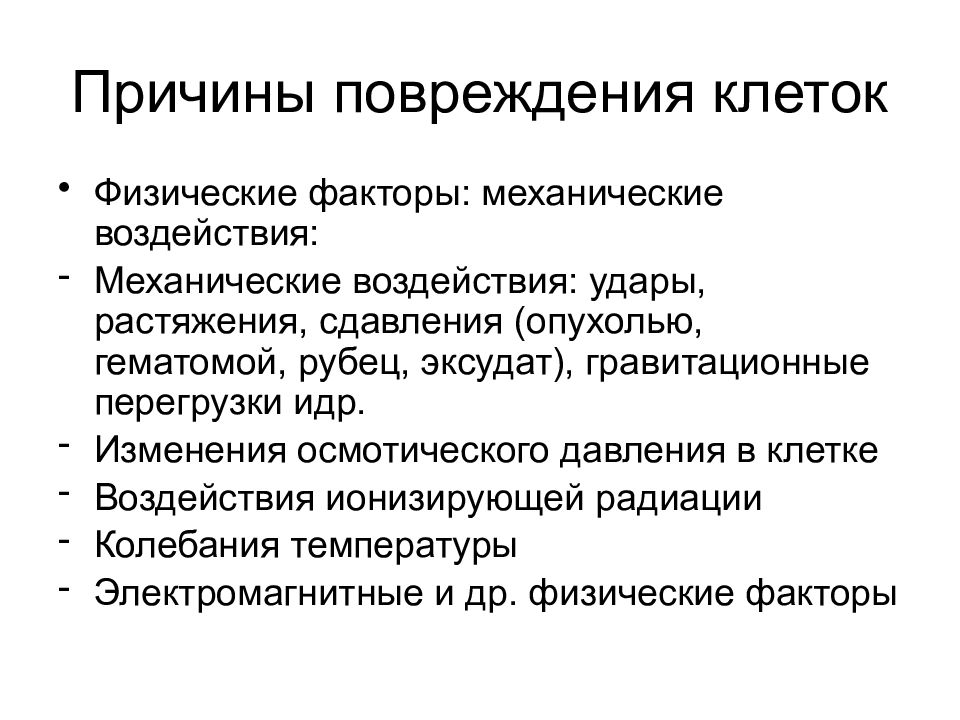 Физические факторы : механические воздействия : Механические воздействия : удары, растяжения, сдавления (опухолью, гематомой, рубец, эксудат), гравитационные перегрузки идр. Изменения осмотического давления в клетке Воздействия ионизирующей радиации Колебания температуры Электромагнитные и др. физические факторы