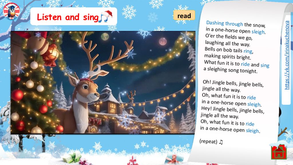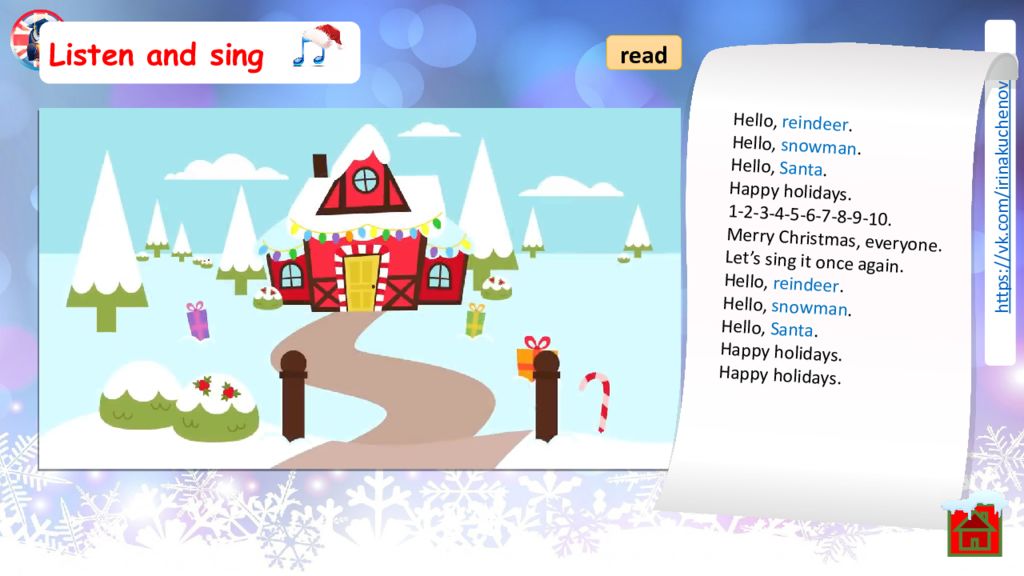 Listen and sing READ read Hello, reindeer. Hello, snowman. Hello, Santa. Happy holidays. 1-2-3-4-5-6-7-8-9-10. Merry Christmas, everyone. Let’s sing it once again. Hello, reindeer. Hello, snowman. Hello, Santa. Happy holidays. Happy holidays.