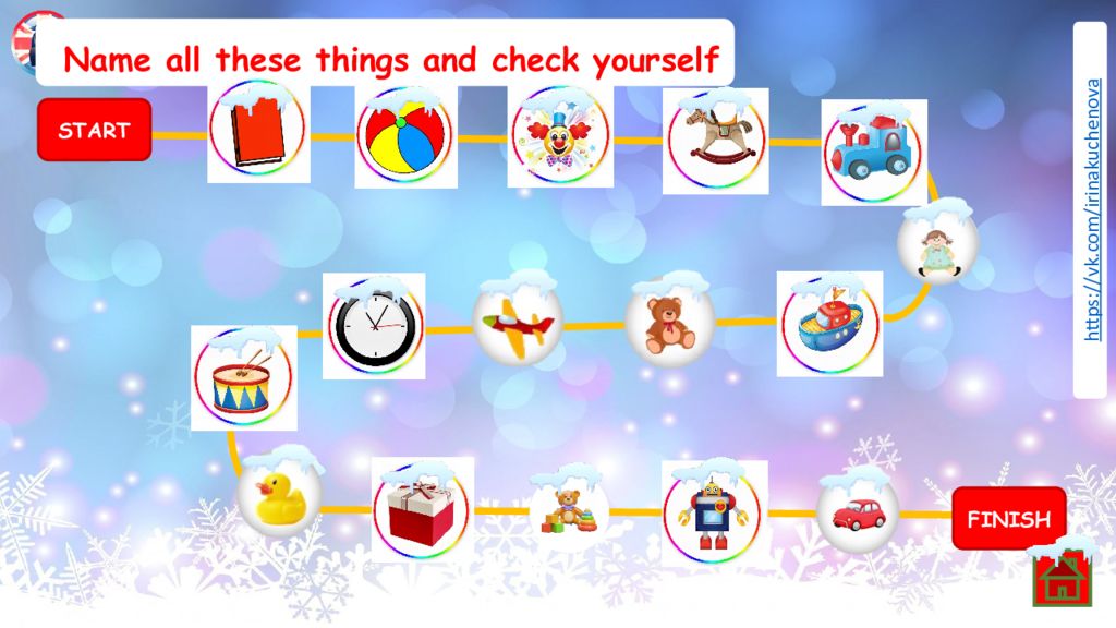 Name all these things and check yourself START FINISH book ball clown horse train ship clock drum toys robot car doll teddy bear present plane duck