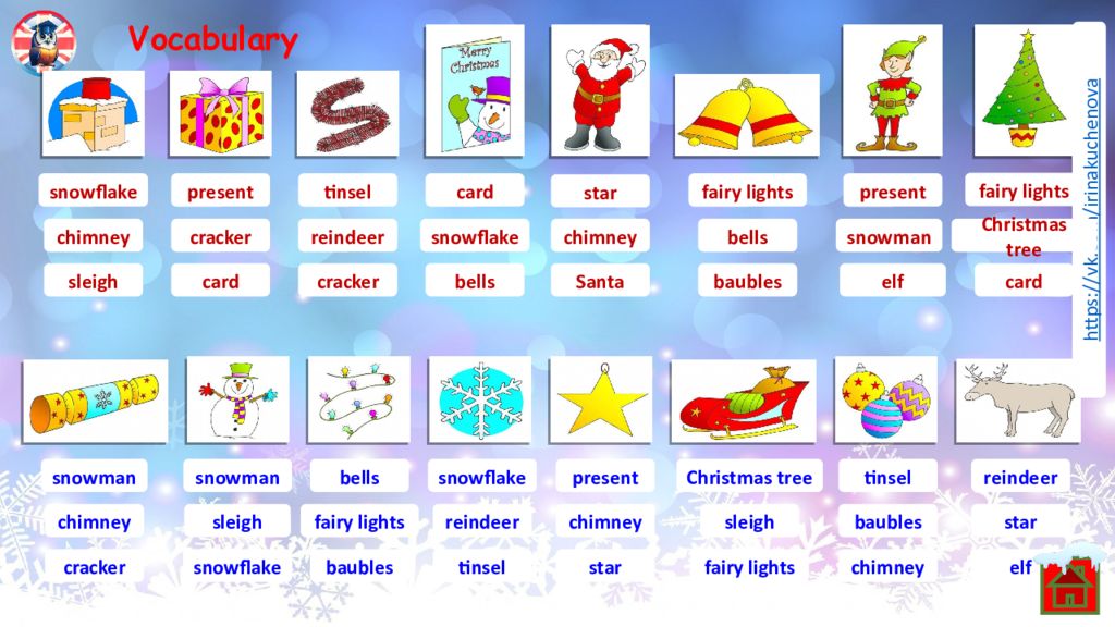 tinsel present Christmas tree star snowflake card snowflake snowman bells reindeer snowman baubles chimney fairy lights tinsel present Vocabulary star cracker snowman snowflake card baubles fairy lights chimney Christmas tree chimney sleigh bells present sleigh chimney reindeer cracker star elf baubles chimney bells tinsel reindeer snowflake card fairy lights cracker sleigh elf fairy lights Santa