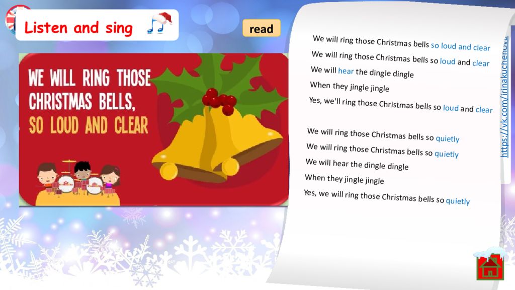 Listen and sing READ read We will ring those Christmas bells so loud and clear We will ring those Christmas bells so loud and clear We will hear the dingle dingle When they jingle jingle Yes, we'll ring those Christmas bells so loud and clear We will ring those Christmas bells so quietly We will ring those Christmas bells so quietly We will hear the dingle dingle When they jingle jingle Yes, we will ring those Christmas bells so quietly