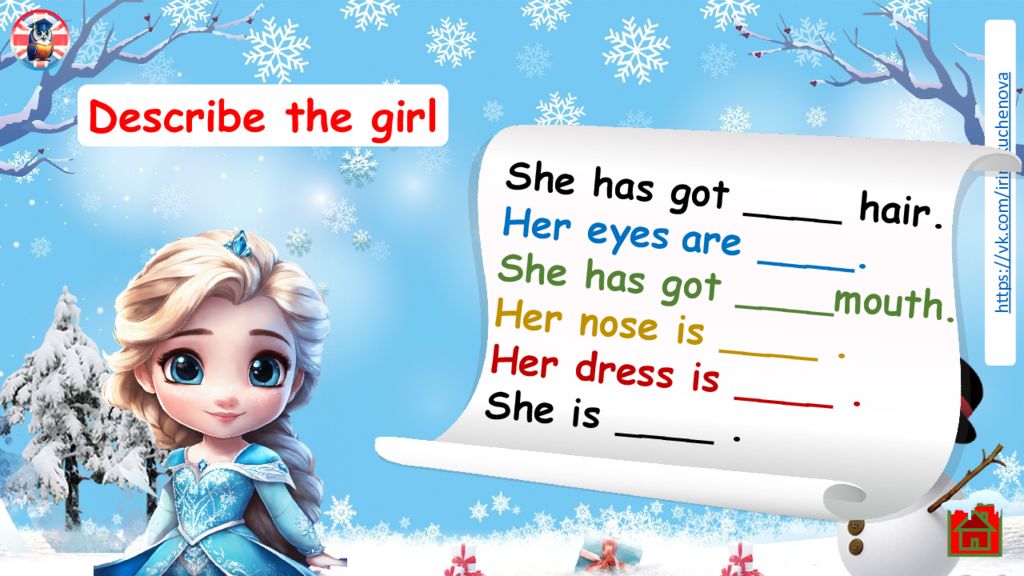 Describe the girl She has got ____ hair. Her eyes are ____. She has got ____mouth. Her nose is ____. Her dress is ____. She is ____.