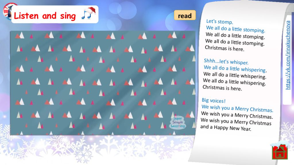 Listen and sing READ read We wish you a Merry Christmas. We wish you a Merry Christmas. We wish you a Merry Christmas and a Happy New Year. Happy holidays to you, your family, your friends. Happy holidays, Merry Christmas, and a Happy New Year. Let's clap. We all do a little clapping. We all do a little clapping. We all do a little clapping. Christmas is here. Let's jump. We all do a little jumping. We all do a little jumping. We all do a little jumping. Christmas is here. Let's stomp. We all do a little stomping. We all do a little stomping. We all do a little stomping. Christmas is here. Shhh...let's whisper. We all do a little whispering. We all do a little whispering. We all do a little whispering. Christmas is here. Big voices! We wish you a Merry Christmas. We wish you a Merry Christmas. We wish you a Merry Christmas and a Happy New Year.