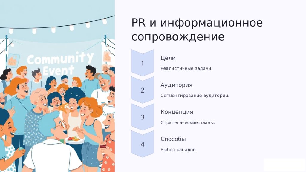 PR и информационное сопровождение Цели Реалистичные задачи. Аудитория Сегментирование аудитории. Концепция Стратегические планы. Способы Выбор каналов.