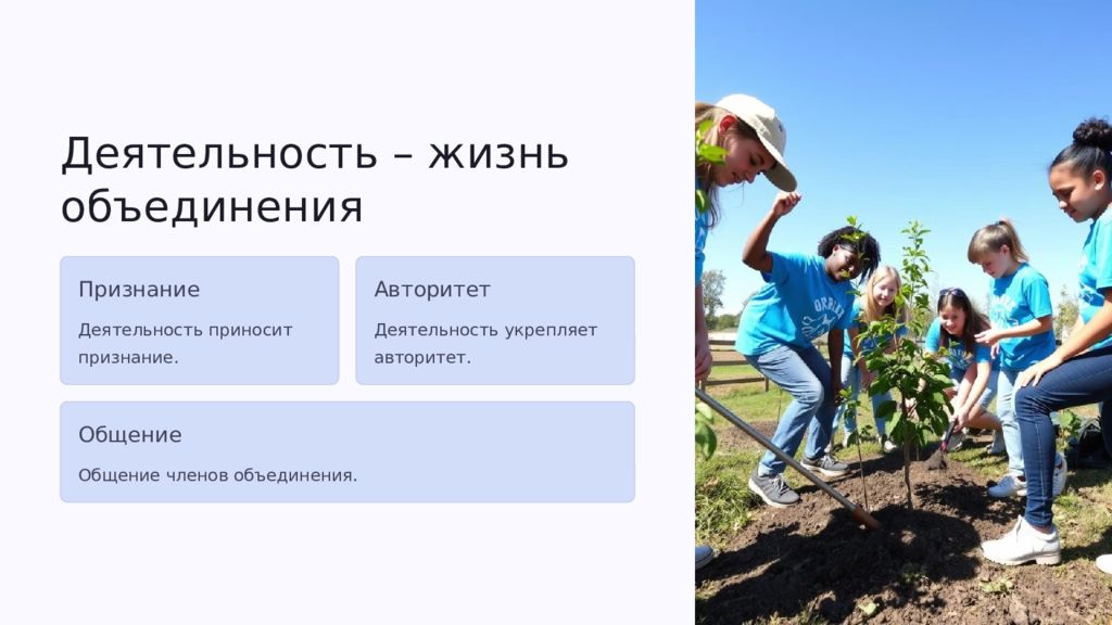 Деятельность – жизнь объединения Признание Деятельность приносит признание. Авторитет Деятельность укрепляет авторитет. Общение Общение членов объединения.