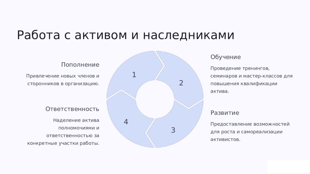 Работа с активом и наследниками Пополнение Привлечение новых членов и сторонников в организацию. 1 Обучение Проведение тренингов, семинаров и мастер-классов для повышения квалификации актива. 2 Развитие Предоставление возможностей для роста и самореализации активистов. 3 Ответственность Наделение актива полномочиями и ответственностью за конкретные участки работы. 4