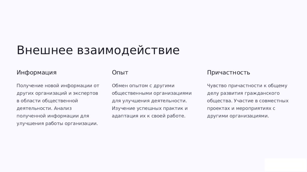 Внешнее взаимодействие Информация Получение новой информации от других организаций и экспертов в области общественной деятельности. Анализ полученной информации для улучшения работы организации. Опыт Обмен опытом с другими общественными организациями для улучшения деятельности. Изучение успешных практик и адаптация их к своей работе. Причастность Чувство причастности к общему делу развития гражданского общества. Участие в совместных проектах и мероприятиях с другими организациями.
