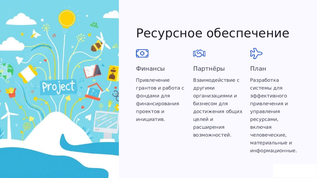 Ресурсное обеспечение Финансы Привлечение грантов и работа с фондами для финансирования проектов и инициатив. Партнёры Взаимодействие с другими организациями и бизнесом для достижения общих целей и расширения возможностей. План Разработка системы для эффективного привлечения и управления ресурсами, включая человеческие, материальные и информационные.