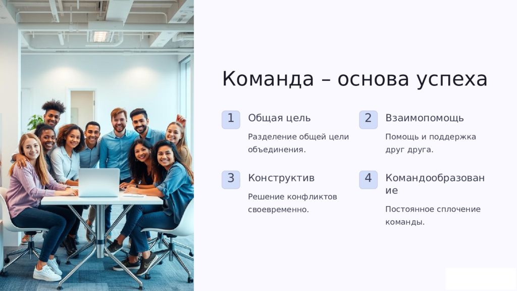 Команда – основа успеха 1 Общая цель Разделение общей цели объединения. 2 Взаимопомощь Помощь и поддержка друг друга. 3 Конструктив Решение конфликтов своевременно. 4 Командообразование Постоянное сплочение команды.