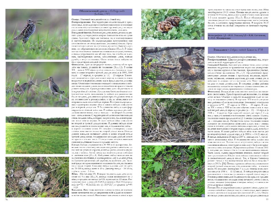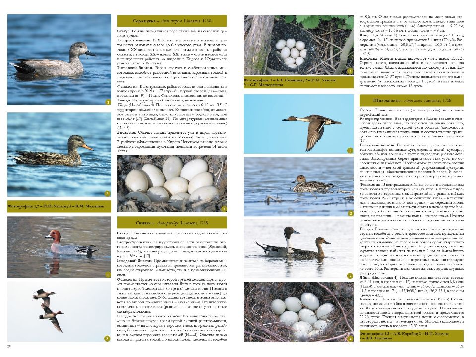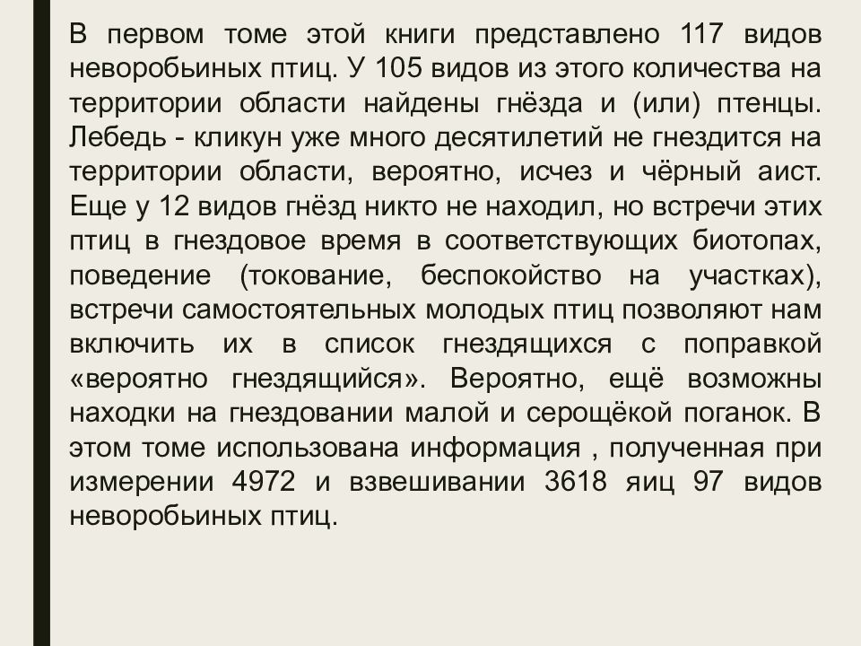 В первом томе этой книги представлено 117 видов неворобьиных птиц. У 105 видов из этого количества на территории области найдены гнёзда и (или) птенцы. Лебедь - кликун уже много десятилетий не гнездится на территории области, вероятно, исчез и чёрный аист. Еще у 12 видов гнёзд никто не находил, но встречи этих птиц в гнездовое время в соответствующих биотопах, поведение (токование, беспокойство на участках), встречи самостоятельных молодых птиц позволяют нам включить их в список гнездящихся с поправкой «вероятно гнездящийся». Вероятно, ещё возможны находки на гнездовании малой и серощёкой поганок. В этом томе использована информация, полученная при измерении 4972 и взвешивании 3618 яиц 97 видов неворобьиных птиц.