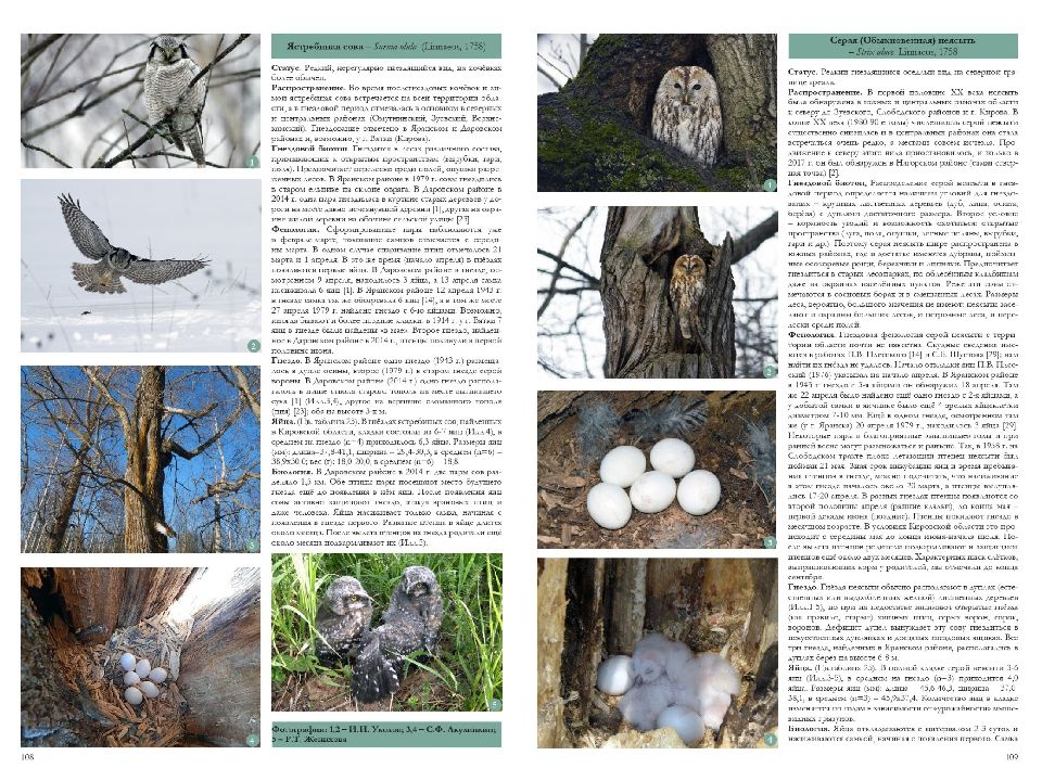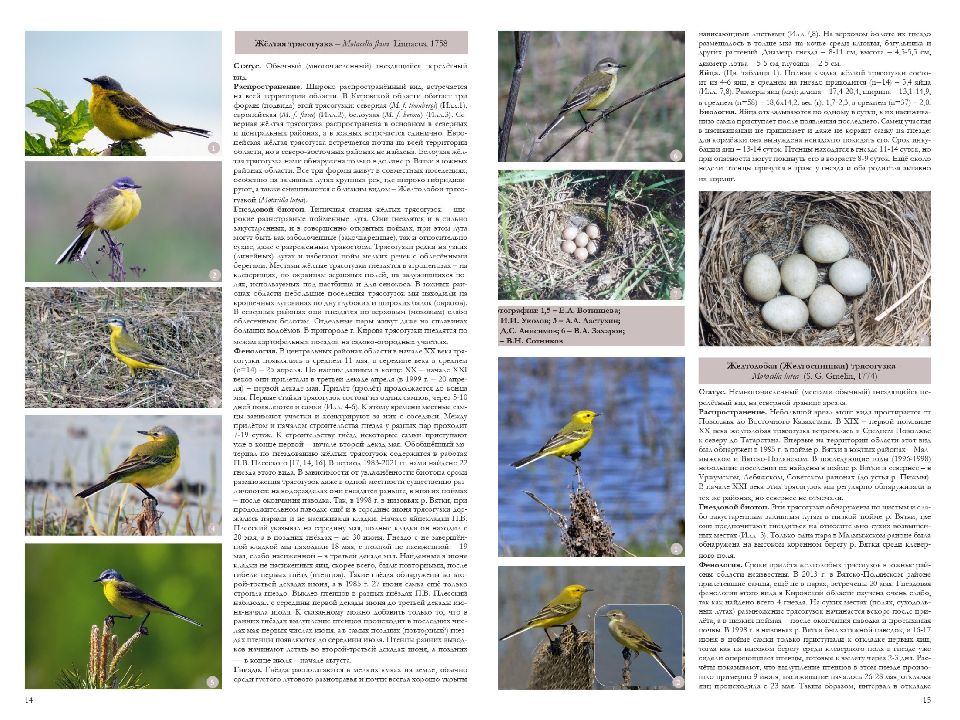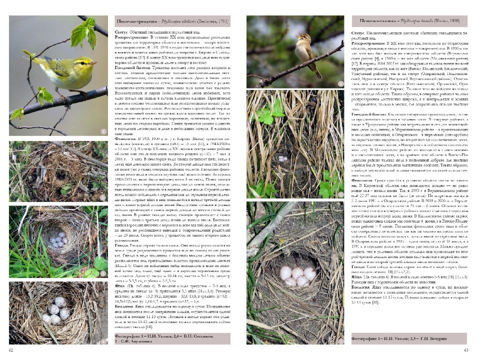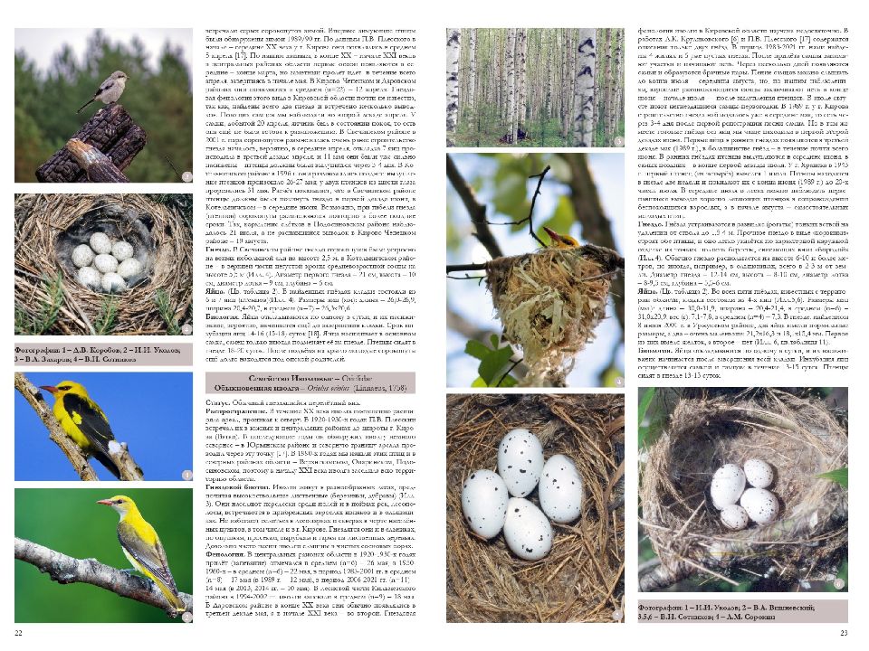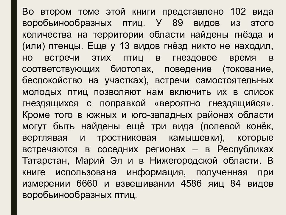 Во втором томе этой книги представлено 102 вида воробьинообразных птиц. У 89 видов из этого количества на территории области найдены гнёзда и (или) птенцы. Еще у 13 видов гнёзд никто не находил, но встречи этих птиц в гнездовое время в соответствующих биотопах, поведение (токование, беспокойство на участках), встречи самостоятельных молодых птиц позволяют нам включить их в список гнездящихся с поправкой «вероятно гнездящийся». Кроме того в южных и юго-западных районах области могут быть найдены ещё три вида (полевой конёк, вертлявая и тростниковая камышевки), которые встречаются в соседних регионах – в Республиках Татарстан, Марий Эл и в Нижегородской области. В книге использована информация, полученная при измерении 6660 и взвешивании 4586 яиц 84 видов воробьинообразных птиц.