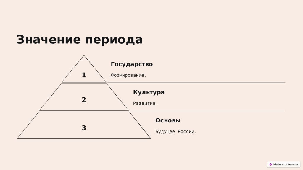 Значение периода 1 Государство Формирование. 2 Культура Развитие. 3 Основы Будущее России.