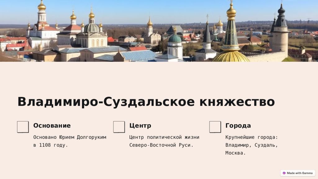 Владимиро-Суздальское княжество Основание Основано Юрием Долгоруким в 1108 году. Центр Центр политической жизни Северо-Восточной Руси. Города Крупнейшие города: Владимир, Суздаль, Москва.