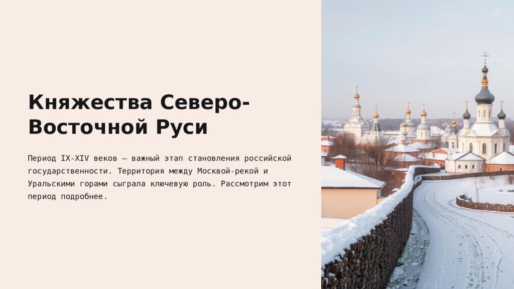 Княжества Северо-Восточной Руси Период IX-XIV веков – важный этап становления российской государственности. Территория между Москвой-рекой и Уральскими горами сыграла ключевую роль. Рассмотрим этот период подробнее.
