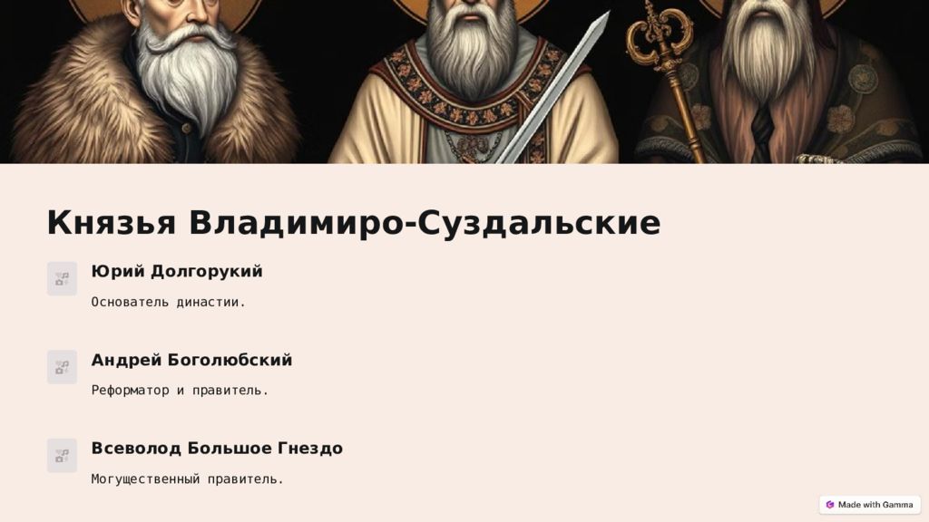 Князья Владимиро-Суздальские Юрий Долгорукий Основатель династии. Андрей Боголюбский Реформатор и правитель. Всеволод Большое Гнездо Могущественный правитель.