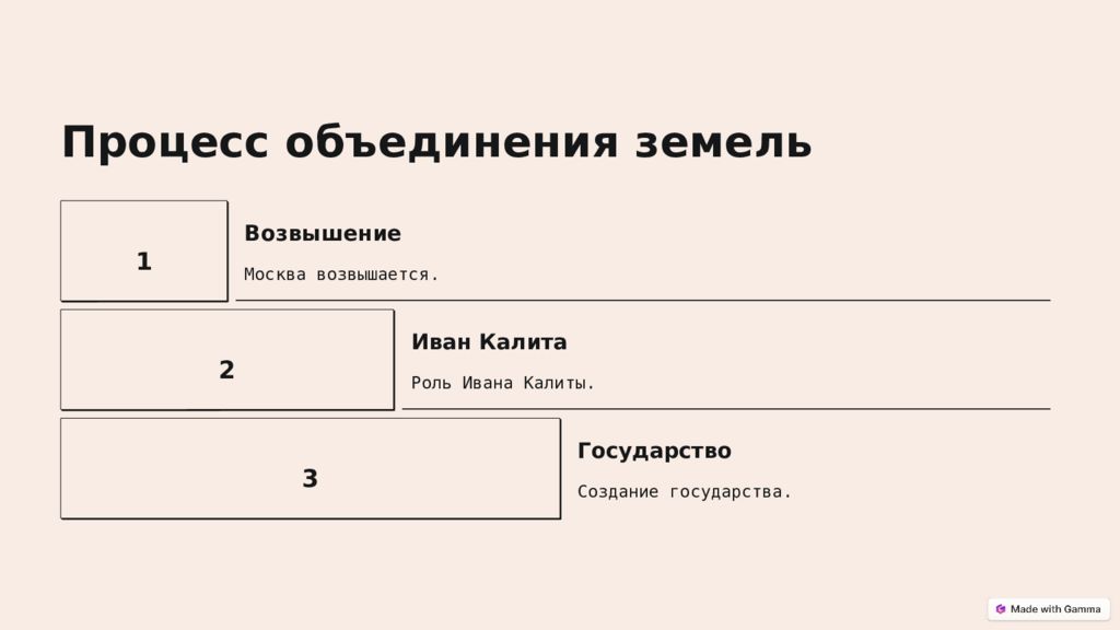 Процесс объединения земель 1 Возвышение Москва возвышается. 2 Иван Калита Роль Ивана Калиты. 3 Государство Создание государства.