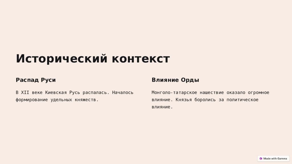 Исторический контекст Распад Руси В XII веке Киевская Русь распалась. Началось формирование удельных княжеств. Влияние Орды Монголо-татарское нашествие оказало огромное влияние. Князья боролись за политическое влияние.