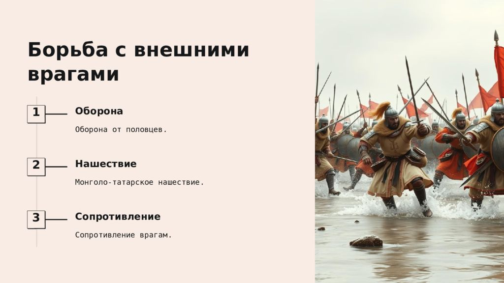 Борьба с внешними врагами 1 Оборона Оборона от половцев. 2 Нашествие Монголо-татарское нашествие. 3 Сопротивление Сопротивление врагам.