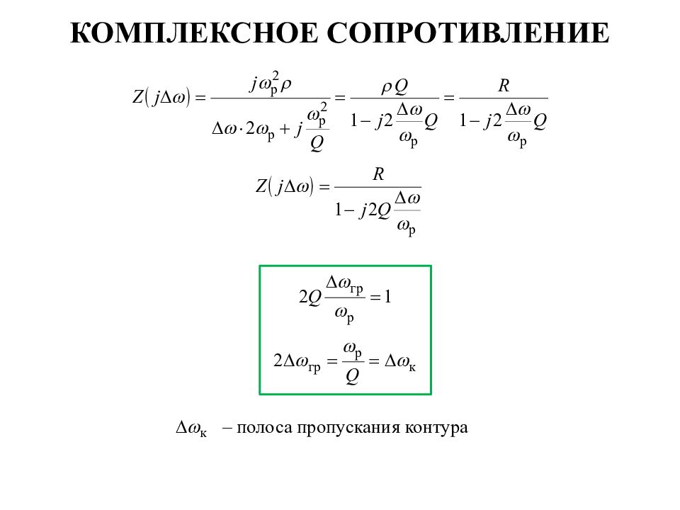 Комплексное Сопротивление Эквивалентное комплексное сопротивление колебательного контура 1) Эквивалентное комплексное сопротивление колебательного контура на резонансной частоте 2) Эквивалентное комплексное сопротивление колебательного контура на частоте вблизи резонанса