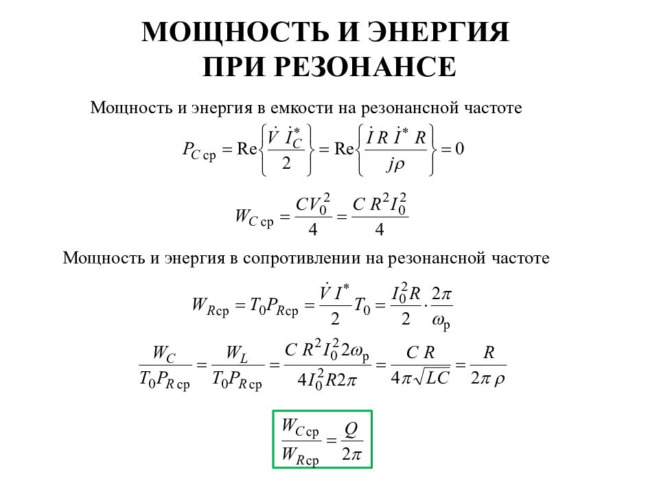 Мощность и ЭНЕРГИЯ при резонансе Мощность и энергия в емкости на резонансной частоте Мощность и энергия в сопротивлении на резонансной частоте