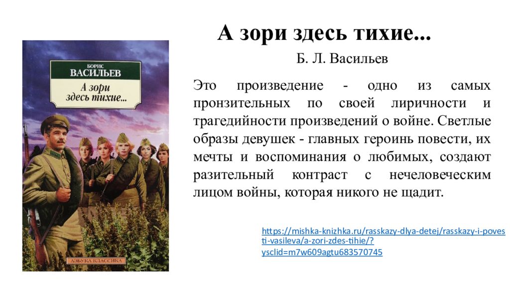 А зори здесь тихие... Б. Л. Васильев Это произведение - одно из самых пронзительных по своей лиричности и трагедийности произведений о войне. Светлые образы девушек - главных героинь повести, их мечты и воспоминания о любимых, создают разительный контраст с нечеловеческим лицом войны, которая никого не щадит. https://mishka-knizhka.ru/rasskazy-dlya-detej/rasskazy-i-povesti-vasileva/a-zori-zdes-tihie/? ysclid=m7w609agtu683570745