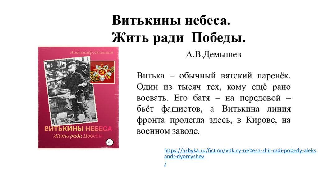 Витька – обычный вятский паренёк. Один из тысяч тех, кому ещё рано воевать. Его батя – на передовой – бьёт фашистов, а Витькина линия фронта пролегла здесь, в Кирове, на военном заводе. Витькины небеса. Жить ради Победы. А.В.Демышев https://azbyka.ru/fiction/vitkiny-nebesa-zhit-radi-pobedy-aleksandr-dyomyshev /