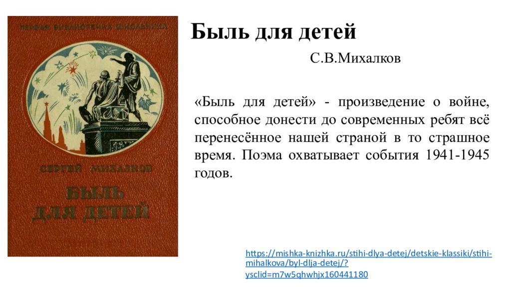 https://mishka-knizhka.ru/stihi-dlya-detej/detskie-klassiki/stihi-mihalkova/byl-dlja-detej/? ysclid=m7w5qhwhjx160441180 Быль для детей С.В.Михалков « Быль для детей» - произведение о войне, способное донести до современных ребят всё перенесённое нашей страной в то страшное время. Поэма охватывает события 1941-1945 годов.