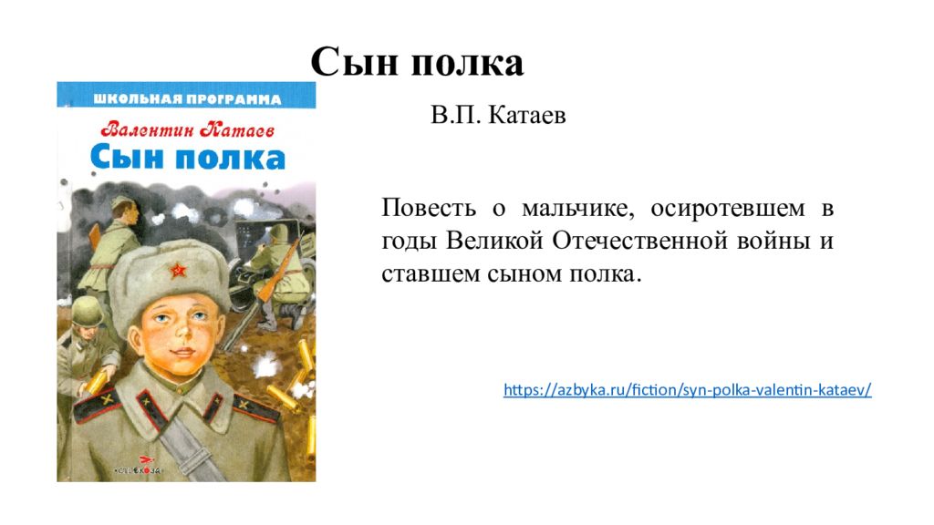 Повесть о мальчике, осиротевшем в годы Великой Отечественной войны и ставшем сыном полка. Сын полка В.П. Катаев https://azbyka.ru/fiction/syn-polka-valentin-kataev /