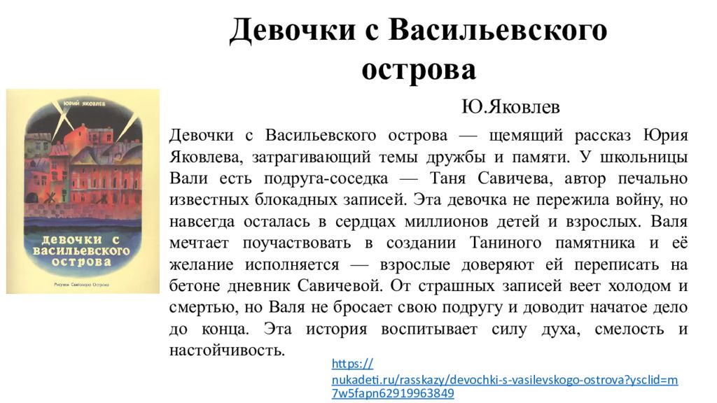Девочки с Васильевского острова Ю.Яковлев Девочки с Васильевского острова — щемящий рассказ Юрия Яковлева, затрагивающий темы дружбы и памяти. У школьницы Вали есть подруга-соседка — Таня Савичева, автор печально известных блокадных записей. Эта девочка не пережила войну, но навсегда осталась в сердцах миллионов детей и взрослых. Валя мечтает поучаствовать в создании Таниного памятника и её желание исполняется — взрослые доверяют ей переписать на бетоне дневник Савичевой. От страшных записей веет холодом и смертью, но Валя не бросает свою подругу и доводит начатое дело до конца. Эта история воспитывает силу духа, смелость и настойчивость. https:// nukadeti.ru/rasskazy/devochki-s-vasilevskogo-ostrova?ysclid=m7w5fapn62919963849