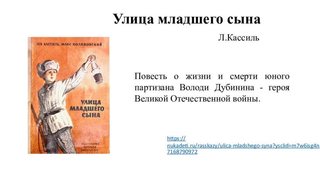 Улица младшего сына Л.Кассиль Повесть о жизни и смерти юного партизана Володи Дубинина - героя Великой Отечественной войны. https:// nukadeti.ru/rasskazy/ulica-mladshego-syna?ysclid=m7w6isg4n7168790972