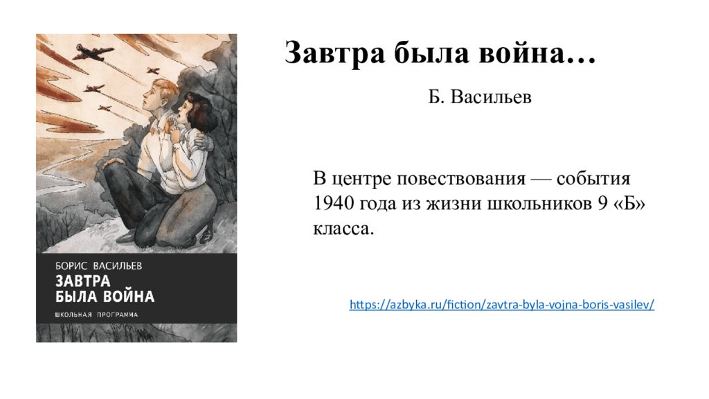 В центре повествования — события 1940 года из жизни школьников 9 «Б» класса. Завтра была война… Б. Васильев https://azbyka.ru/fiction/zavtra-byla-vojna-boris-vasilev /