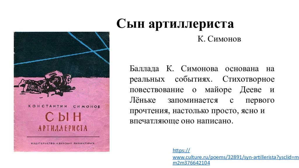 Сын артиллериста К. Симонов https:// www.culture.ru/poems/32891/syn-artillerista?ysclid=m7w5ktkm2m376642104 Баллада К. Симонова основана на реальных событиях. Стихотворное повествование о майоре Дееве и Лёньке запоминается с первого прочтения, настолько просто, ясно и впечатляюще оно написано.