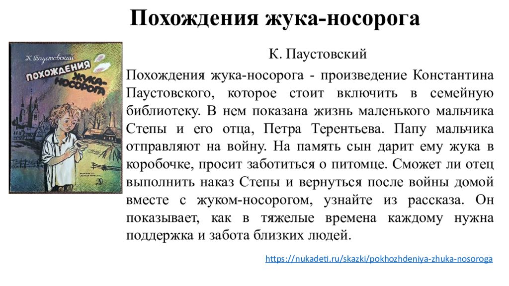 Похождения жука-носорога - произведение Константина Паустовского, которое стоит включить в семейную библиотеку. В нем показана жизнь маленького мальчика Степы и его отца, Петра Терентьева. Папу мальчика отправляют на войну. На память сын дарит ему жука в коробочке, просит заботиться о питомце. Сможет ли отец выполнить наказ Степы и вернуться после войны домой вместе с жуком-носорогом, узнайте из рассказа. Он показывает, как в тяжелые времена каждому нужна поддержка и забота близких людей. Похождения жука-носорога К. Паустовский https:// nukadeti.ru/skazki/pokhozhdeniya-zhuka-nosoroga