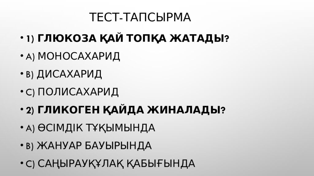 1) Глюкоза қай топқа жатады ? A) моносахарид B) дисахарид C) полисахарид 2) Гликоген қайда жиналады ? A) өсімдік тұқымында B) жануар бауырында C) саңырауқұлақ қабығында