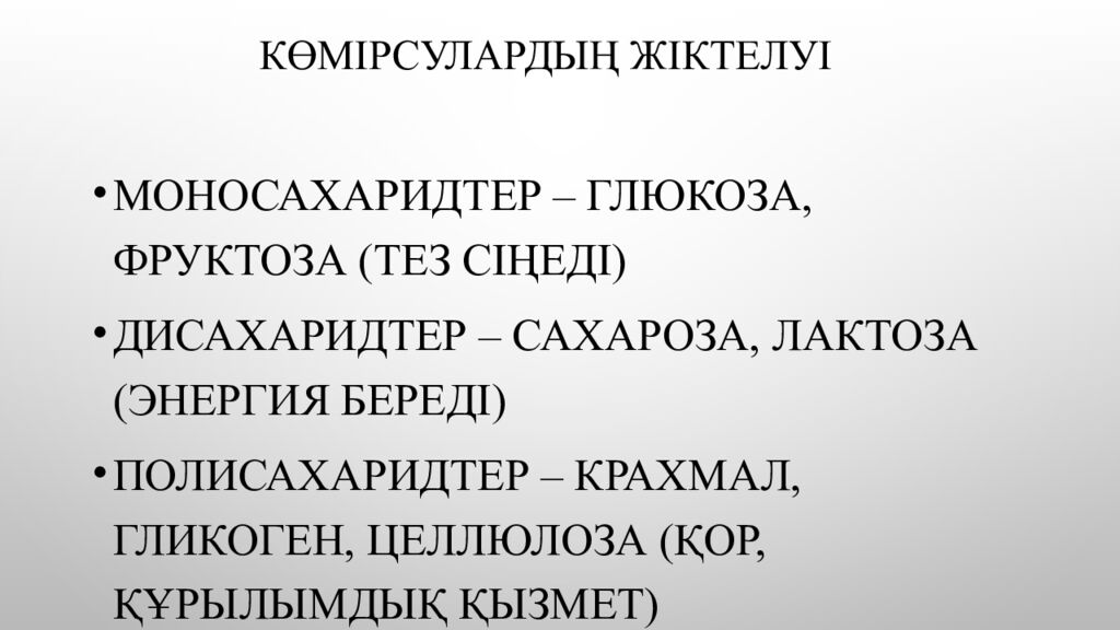 Моносахаридтер – глюкоза, фруктоза ( тез сіңеді ) Дисахаридтер – сахароза, лактоза ( энергия береді ) Полисахаридтер – крахмал, гликоген, целлюлоза ( қор, құрылымдық қызмет )
