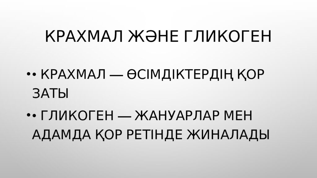 • Крахмал — өсімдіктердің қор заты • Гликоген — жануарлар мен адамда қор ретінде жиналады