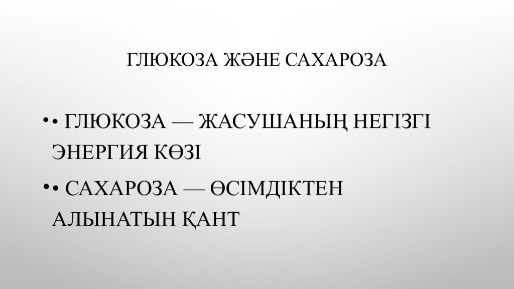 • Глюкоза — жасушаның негізгі энергия көзі • Сахароза — өсімдіктен алынатын қант