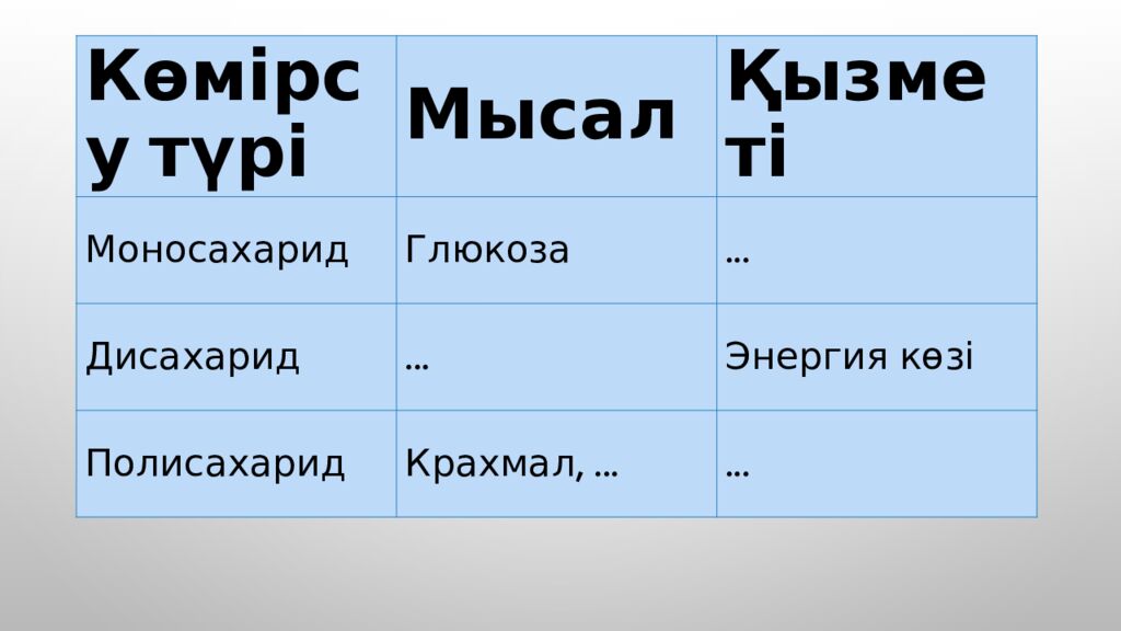 Көмірсу түрі Мысал Қызметі Моносахарид Глюкоза ... Дисахарид ... Энергия көзі Полисахарид Крахмал,... ...