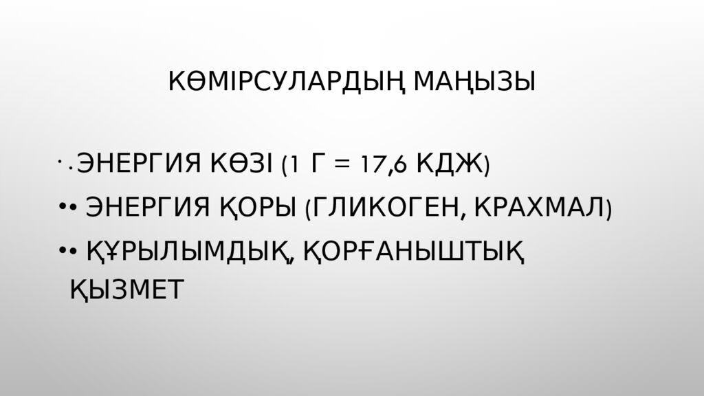 • Энергия көзі (1 г = 17,6 кДж ) • Энергия қоры ( гликоген, крахмал ) • Құрылымдық, қорғаныштық қызмет
