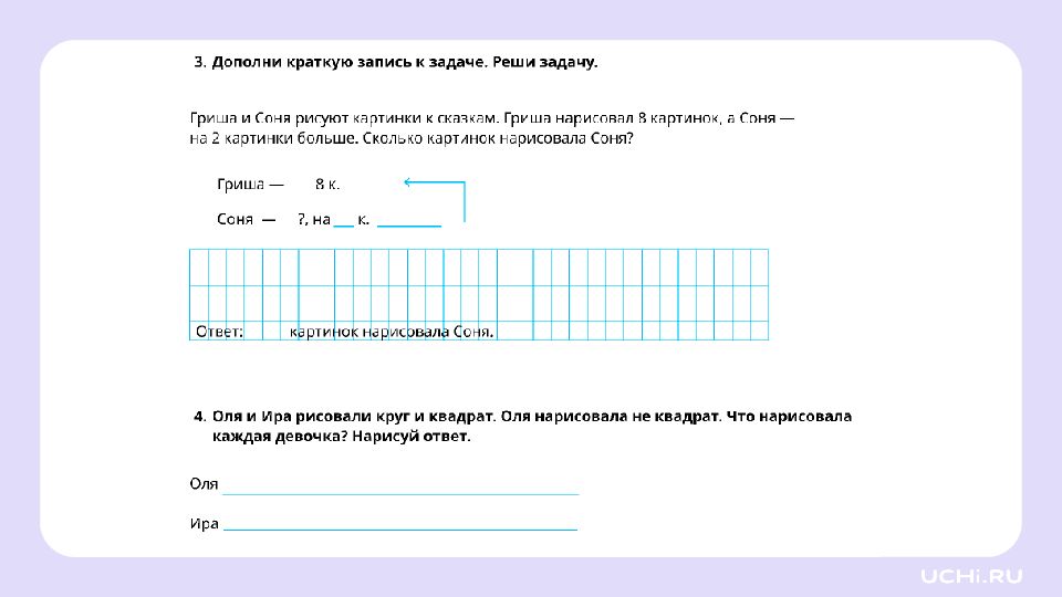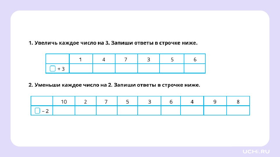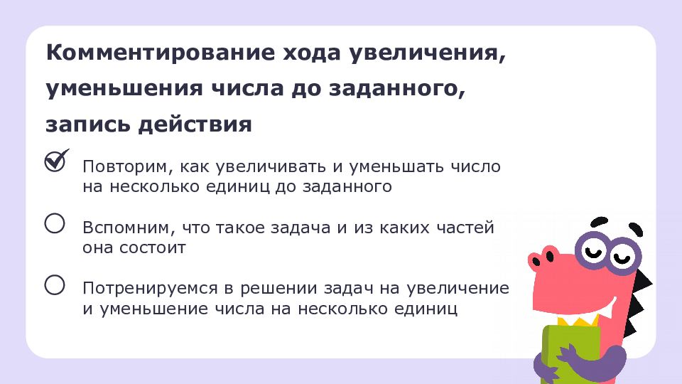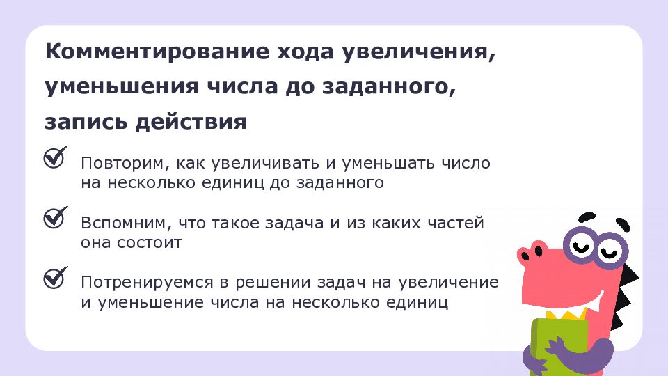 Комментирование хода увеличения, уменьшения числа до заданного, запись действия Повторим, как увеличивать и уменьшать число на несколько единиц до заданного Вспомним, что такое задача и из каких частей она состоит Потренируемся в решении задач на увеличение и уменьшение числа на несколько единиц