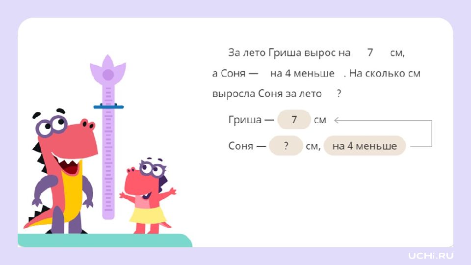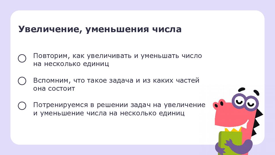 У величени е, уменьшения числа Повторим, как увеличивать и уменьшать число на несколько единиц Вспомним, что такое задача и из каких частей она состоит Потренируемся в решении задач на увеличение и уменьшение числа на несколько единиц