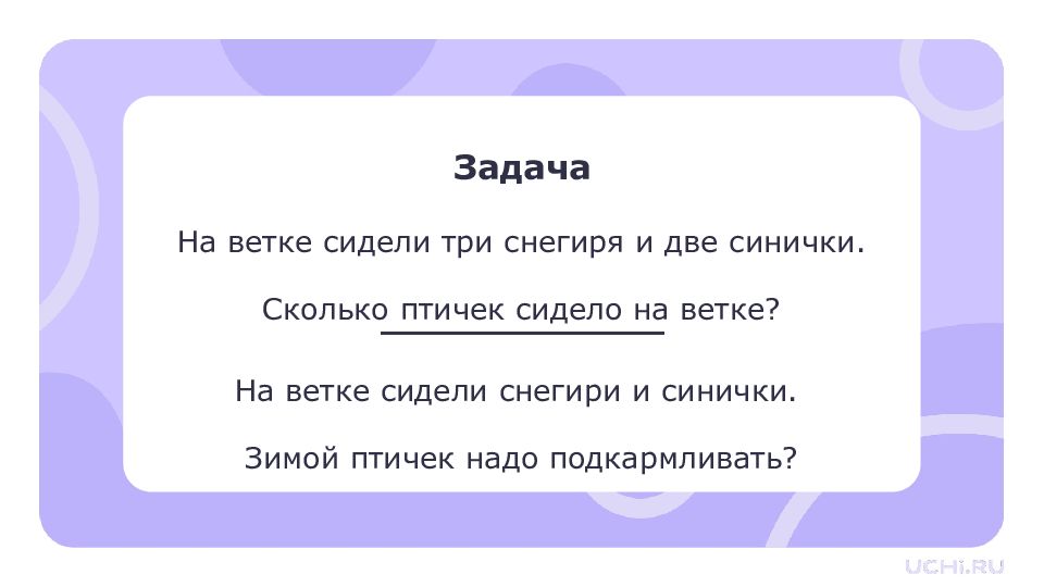 Задача На ветке сидели три снегиря и две синички. Сколько птичек сидело на ветке? На ветке сидели снегири и синички. Зимой птичек надо подкармливать?