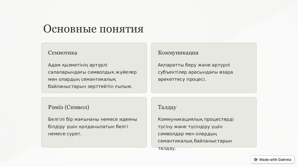 Основные понятия Семиотика Адам қызметінің әртүрлі салаларындағы символдық жүйелер мен олардың семантикалық байланыстарын зерттейтін ғылым. Коммуникация Ақпаратты беру және әртүрлі субъектілер арасындағы өзара әрекеттесу процесі. Рәміз (Символ) Белгілі бір мағынаны немесе идеяны білдіру үшін қолданылатын белгі немесе сурет. Талдау Коммуникациялық процестерді түсіну және түсіндіру үшін символдар мен олардың семантикалық байланыстарын талдау.