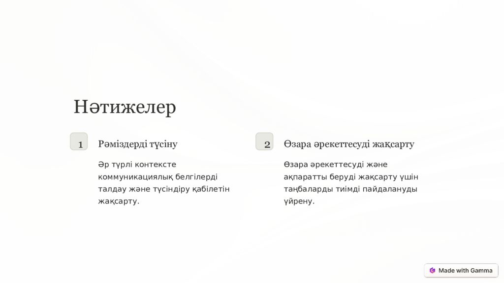 Нәтижелер 1 Рәміздерді түсіну Әр түрлі контексте коммуникациялық белгілерді талдау және түсіндіру қабілетін жақсарту. 2 Өзара әрекеттесуді жақсарту Өзара әрекеттесуді және ақпаратты беруді жақсарту үшін таңбаларды тиімді пайдалануды үйрену.