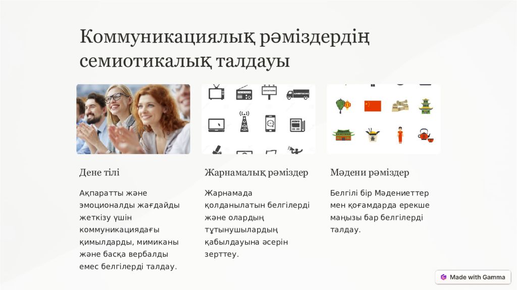 Коммуникациялық рәміздердің семиотикалық талдауы Дене тілі Ақпаратты және эмоционалды жағдайды жеткізу үшін коммуникациядағы қимылдарды, мимиканы және басқа вербалды емес белгілерді талдау. Жарнамалық рәміздер Жарнамада қолданылатын белгілерді және олардың тұтынушылардың қабылдауына әсерін зерттеу. Мәдени рәміздер Белгілі бір Мәдениеттер мен қоғамдарда ерекше маңызы бар белгілерді талдау.