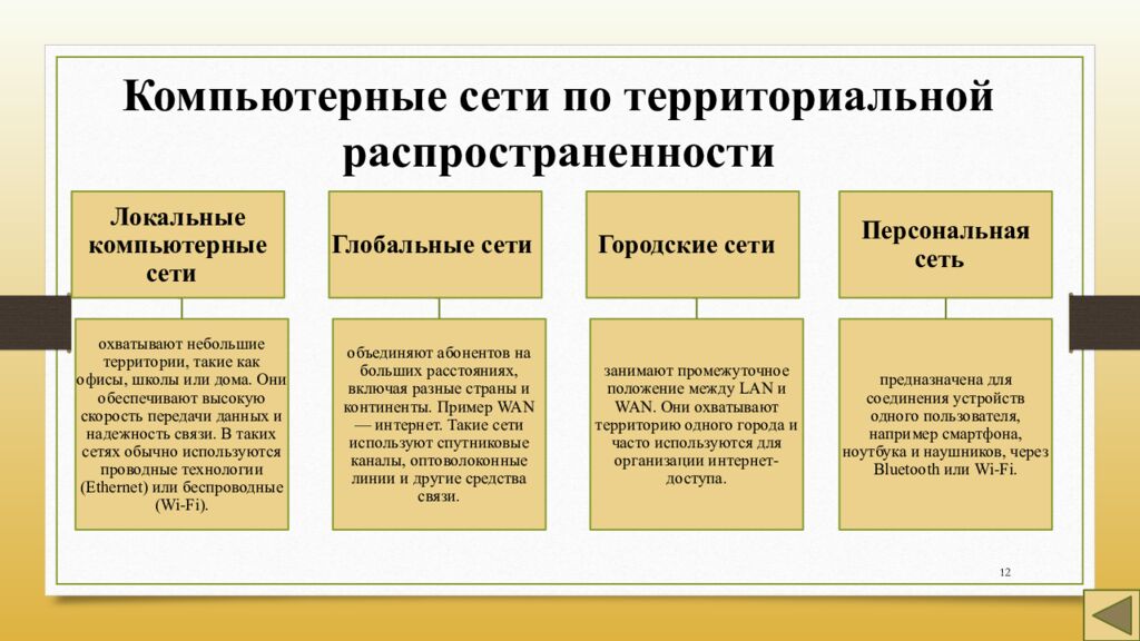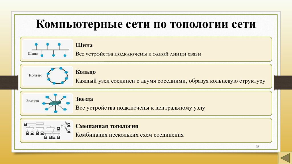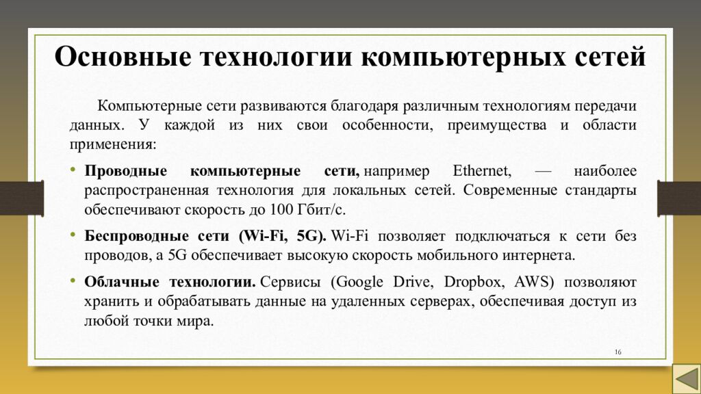 Компьютерные сети развиваются благодаря различным технологиям передачи данных. У каждой из них свои особенности, преимущества и области применения: Проводные компьютерные сети, например Ethernet, — наиболее распространенная технология для локальных сетей. Современные стандарты обеспечивают скорость до 100 Гбит/с. Беспроводные сети ( Wi-Fi, 5G). Wi-Fi позволяет подключаться к сети без проводов, а 5G обеспечивает высокую скорость мобильного интернета. Облачные технологии. Сервисы ( Google Drive, Dropbox, AWS) позволяют хранить и обрабатывать данные на удаленных серверах, обеспечивая доступ из любой точки мира. 16
