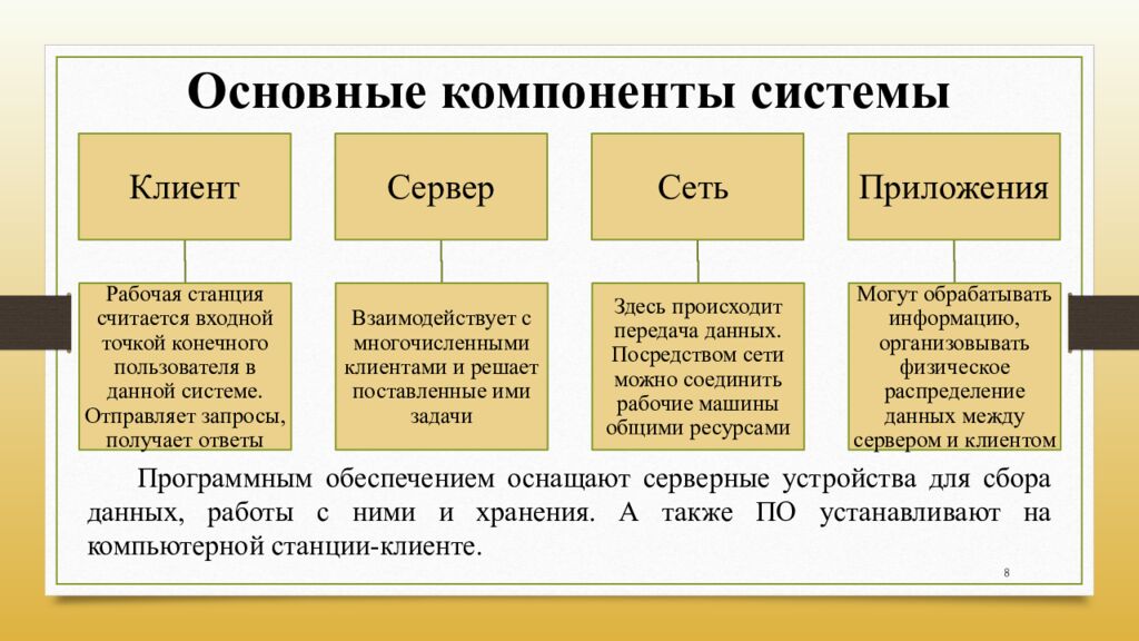 Программным обеспечением оснащают серверные устройства для сбора данных, работы с ними и хранения. А также ПО устанавливают на компьютерной станции-клиенте. 8
